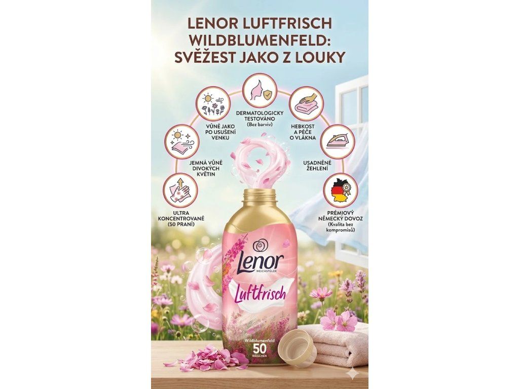 Milujete ten svěží, čistý pocit, když prádlo voní jako po usušení na čerstvém vzduchu? Přesně tenhle zážitek vám zprostředkuje koncentrovaná aviváž Lenor Luftfrisch Wildblumenfeld – inspirovaná přírodou, s jemnou vůní divokých květin a účinkem jako po usušení venku. Stačí jedna malá dávka a vaše prádlo bude hebké, voňavé a svěží až do dalšího praní.