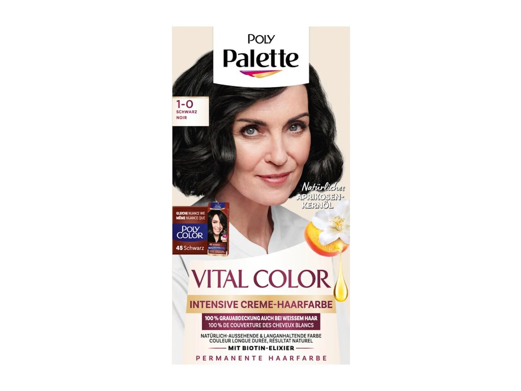 Objevte sílu sytého černého odstínu s dlouhotrvajícím efektem. Permanentní barva na vlasy Poly Palette VITAL COLOR v odstínu 1-0 Černá nabízí intenzivní barevný výsledek s dokonalým krytím šedin. Díky obsahu přírodního meruňkového oleje a biotinového elixíru poskytuje barva vlasům nejen oslnivou barvu, ale i hebkost a vitalitu.