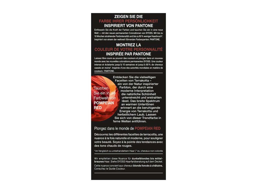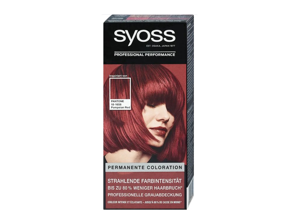Rozjasněte svůj styl ikonickou a svůdnou barvou. Syoss Pompejská červená 18-1658 je profesionální permanentní barva, která nabízí sytou červenou s maximální intenzitou a dlouhotrvajícím leskem. Chrání vlasy a výrazně snižuje lámavost – ideální i pro šediny.
