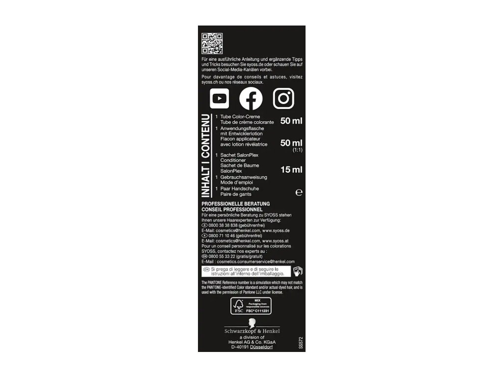 Parametry: | Složení: voda, cetearylalkohol, hydroxid amonný, glycerylstearát SE, ceteareth-20, 1-hydroxyethyl-4,5-diaminopyrazol sulfát, oktyldodekanol, sodium laureth sulfát, 4-amino-2-hydroxytoluen, cetearyl sulfát sodný, parfém, m-aminofenol, kyselina olejová, siřičitan sodný, ethanolamin, glycerin, kyselina etidronová, karbomer, hydroxid draselný, kyselina askorbová, serin, linalool, citronellol, síran sodný, kyselina benzoová Kondicionér: voda, cetearylalkohol, chlorid behentrimoniový, dimetikon, amodimethikon/morfolinomethylsilseskvioxan kopolymer, citrát hořečnatý, chlorid hořečnatý, hydrolyzovaný keratin, polyquaternium-37, steardimonium hydroxypropyl hydrolyzovaný keratin, panthenol, isopropylmyristát, glycerylstearát, kyselina citronová, fenoxyethanol, stearamidopropyl dimethylamin, isopropylalkohol, methylparaben sodný, parfém, dikaprylylkarbonát, laureth-23, laureth-4, hydroxid sodný, linalool, hexyl cinnamal, chlorid sodný, kyselina salicylová, trideceth-5, lauryl glukosid, síran sodný Oxidační emulze: voda, peroxid vodíku, cetearylalkohol, PEG-40 ricinový olej, kyselina etidronová, cetearyl sulfát sodný, 2,6-dikarboxypyridin, disodná sůl pyrofosforečná, hydroxid draselný, benzoan sodný Upozornění a bezpečnostní pokyny: Barvy na vlasy mohou způsobit silné alergické reakce. Nepoužívat u osob mladších 16 let. Dočasná tetování černou hennou mohou zvýšit riziko alergie. Neaplikujte barvu, pokud máte vyrážku v obličeji, podrážděnou, citlivou nebo poraněnou pokožku hlavy, pokud jste již zaznamenali reakci po barvení vlasů nebo pokud jste reagovali na dočasné tetování černou hennou. Obsahuje peroxid vodíku. Nepoužívat k barvení řas a obočí. Po použití vlasy důkladně opláchněte. Proveďte test na alergii 48 hodin před každým použitím, i pokud jste již výrobek používali. Produkt zakupte minimálně 48 hodin před použitím. V případě podráždění nebo pochybností se poraďte s dermatologem. Zamezte styku s očima, při zasažení je ihned důkladně vypláchněte vodou. Používejte vhodné ochranné rukavice. Uchovávejte mimo dosah dětí. |