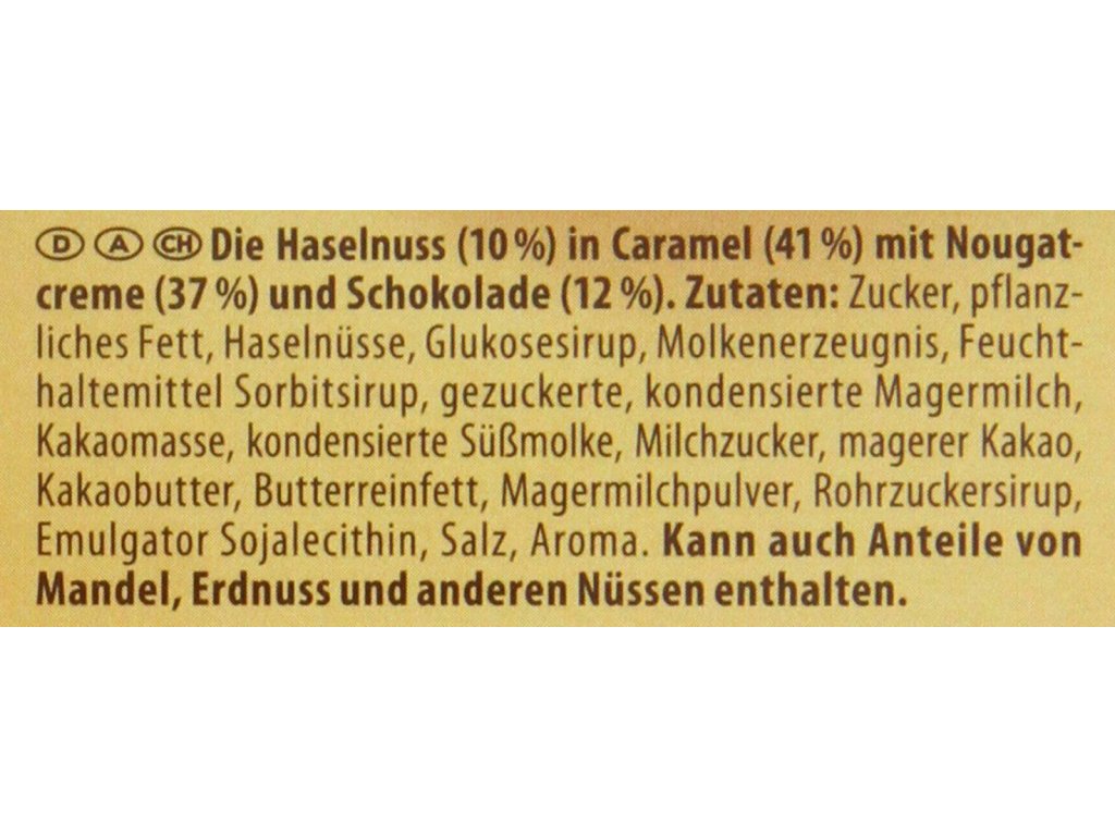 Parametry: | Celé jádra LÍSKOVÝCH oříšků (10%) v karamelu (41%) s lískoořechovým krémem (37%) a čokoládou (12%). Výrobek je složen z cukru, rostlinného tuku, jader LÍSKOVÝCH OŘECHŮ (10 %), výrobků ze SYROVÁTKY, glukózového sirupu, E420 – sorbitolu, zahuštěného slazeného odstředěného MLÉKA, kakaové hmoty, zahuštěné sladké SYROVÁTKY, laktózy, odtučněného kakaového prášku, kakaového másla, máselného tuku, sušeného odstředěného MLÉKA, tekutého třtinového cukru, E322 – lecitinu, soli a aromat. Může obsahovat stopy mandlí, LÍSKOVÝCH OŘECHŮ a jiných OŘECHŮ. Výživové údaje na 100g: Energetická hodnota: 2153kcal/516kj, Tuk: 28,7g (z toho 12,6g nasycené mastné kyseliny), Sacharidy: 58,5(z toho 48,5g cukr), Bílkoviny: 5,9g, Sůl: 0,22g Minimální trvanlivost: uvedeno na obalu Vyrobeno v Německu. Výrobce: uvedeno na obalu. |