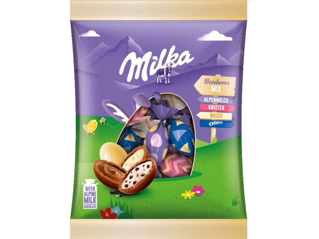 Milka velikonoční čokoládová vajíčka mix bonbonů přinášejí pestrou kombinaci chutí jemné alpské mléčné čokolády a oblíbených Milka specialit. Jsou ideální do velikonoční nadílky, jako drobný dárek nebo jako sladká radost pro celou rodinu.