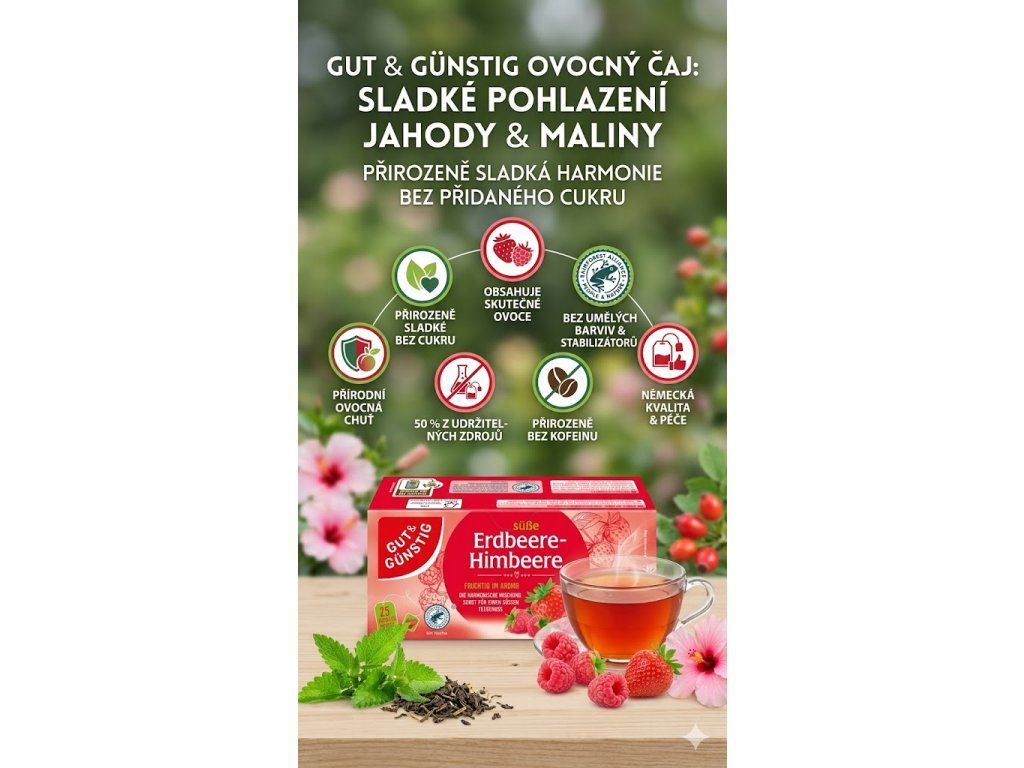 Sladký ovocný čaj Jahoda & Malina od GUT & GÜNSTIG v praktickém balení 25 sáčků. Bez kofeinu, bez cukru, s ovocným aroma. 50 % surovin z udržitelného zemědělství. Výborný i pro děti.