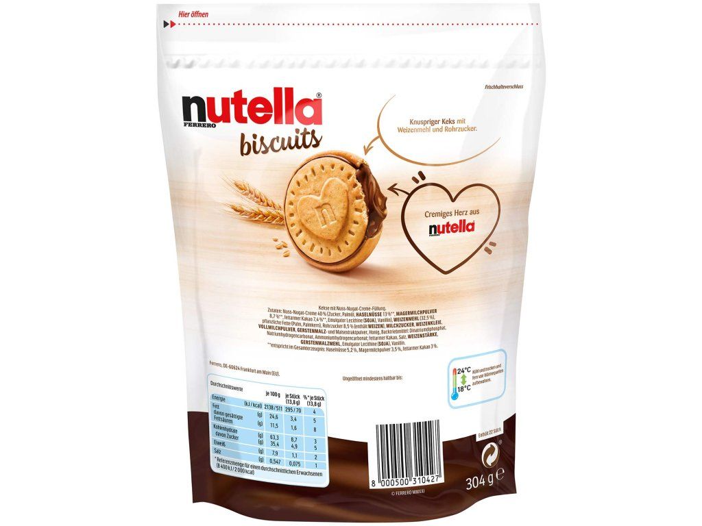 Balení: Sušenky Nutella jsou baleny ve speciálním balení, které udržuje sušenky čerstvé a chrání je před rozdrcením.