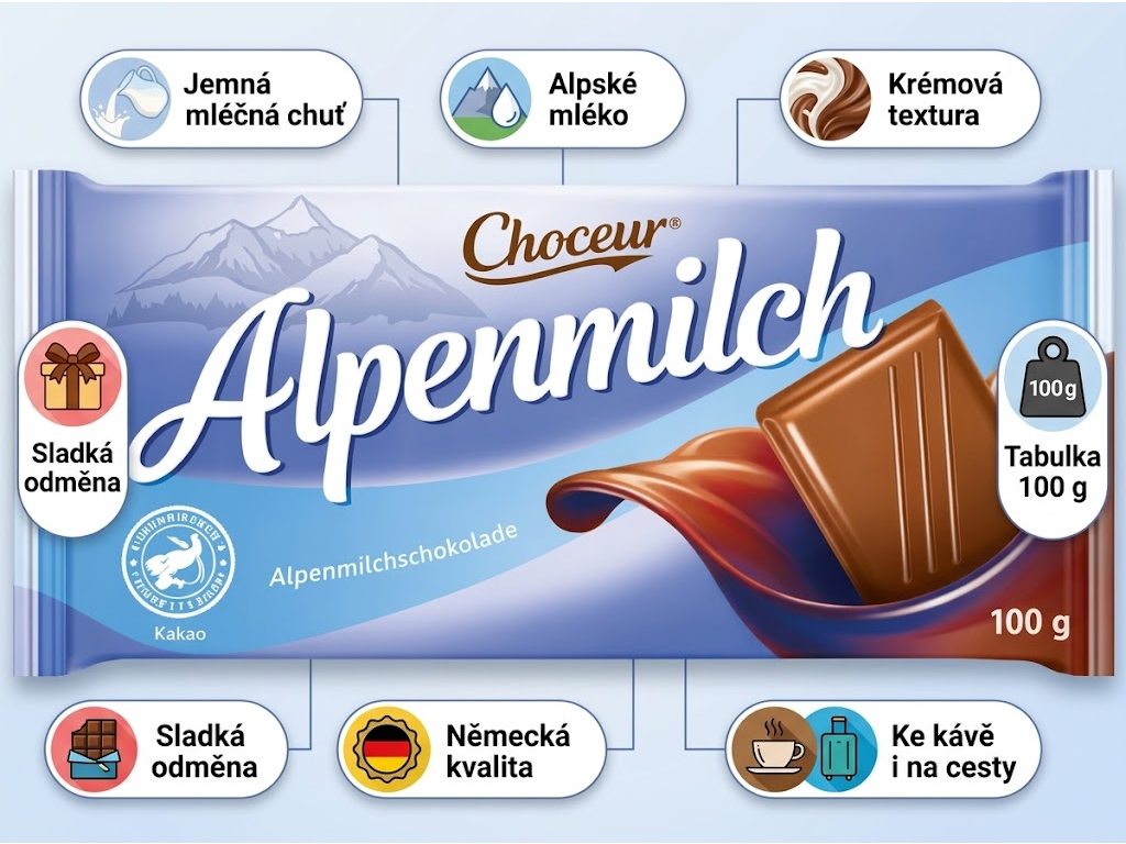 Choceur Alpenmilch mléčná čokoláda 100 g je přesně ten typ sladké klasiky, po které sáhneš, když chceš něco hebkého, mléčného a příjemně vyváženého. Tahle mléčná čokoláda z alpského mléka působí hladce, jemně se rozplývá na jazyku a hodí se jak ke kávě, tak jako malá odměna během dne.