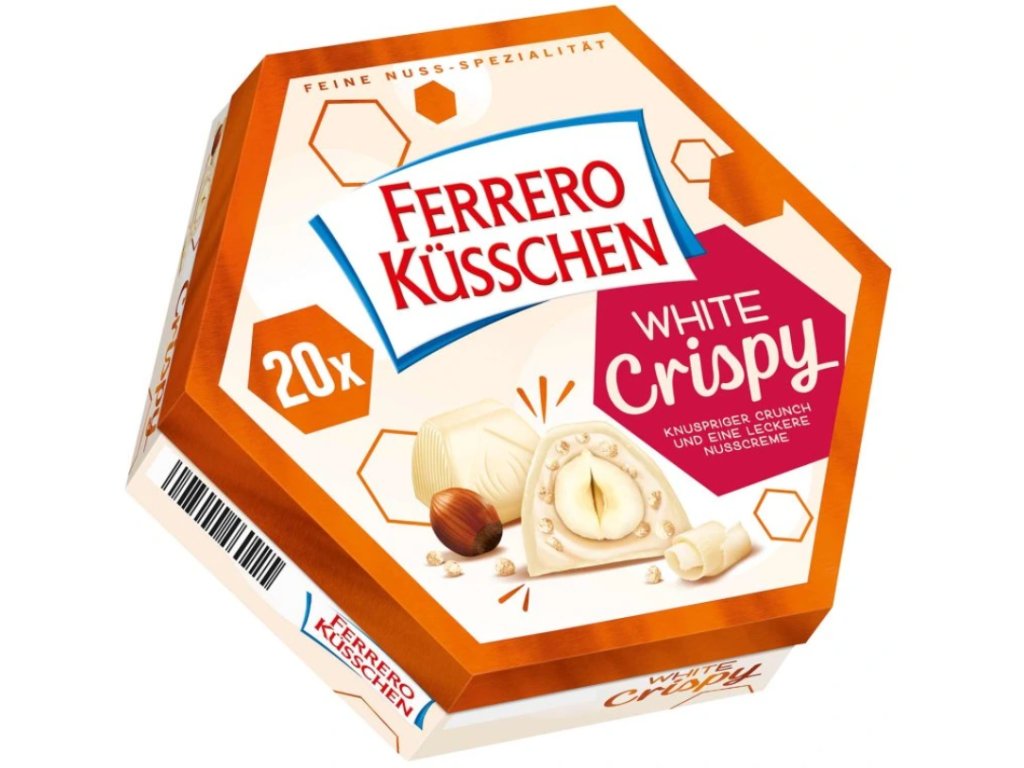 - čokoládové pralinky z bílé čokolády s křupavými pečenými lískovými ořechy zabalené v bílé čokoládě a křupinkami.