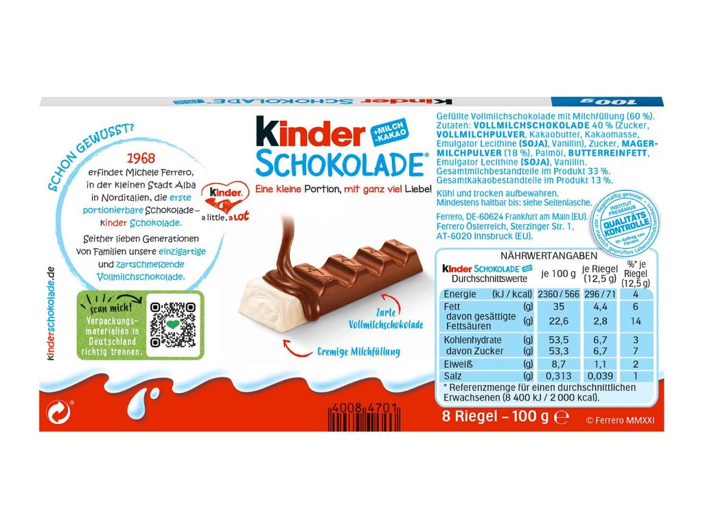 Kinder je značka skupiny Ferrero, která si od svého vzniku klade za cíl přinášet radost, důvěru a kvalitu do každodenního života. Kinder čokoláda byla prvním produktem vyvinutým přímo pro děti, a to s důrazem na jemnou chuť, kvalitní složení a snadné porcionování. Dnes je Kinder symbolem čisté radosti a poctivé výroby. Produkty Kinder jsou v Německu velmi oblíbené – u nás dostupné exkluzivně.