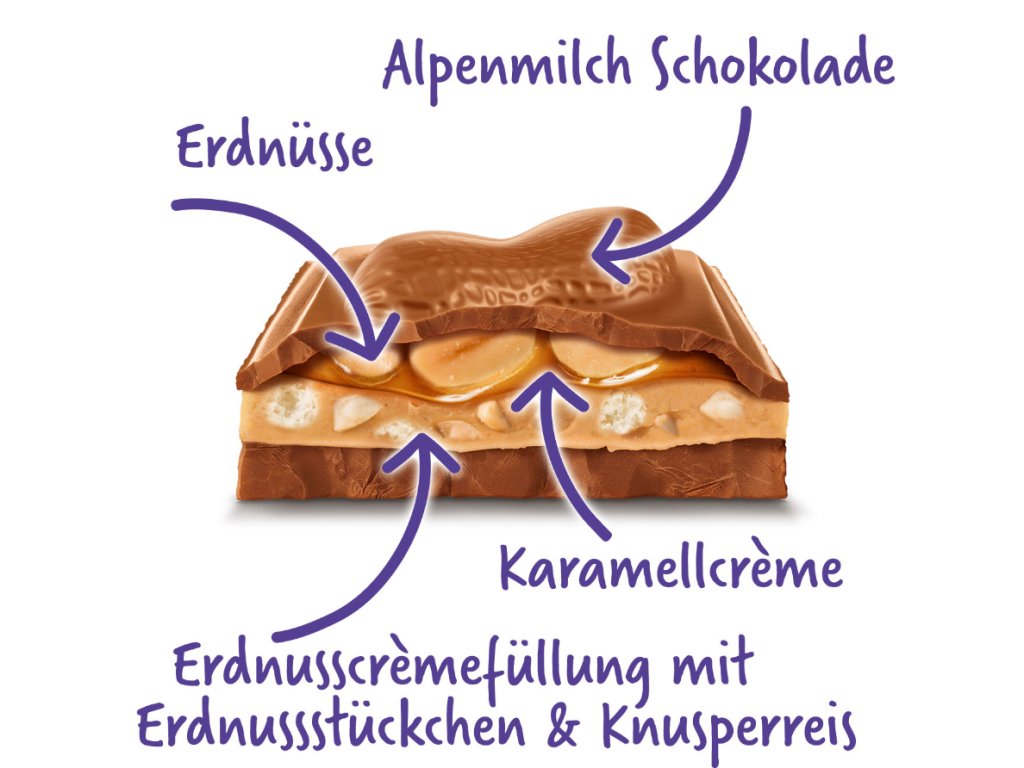 Zlatý standard v kombinaci chutí: Tato čokoláda je bohatá na chuťové vrstvy, které vás okouzlí při každém soustu. Arašídová krémová náplň, která je křupavá díky rýžovým cereáliím, se skvěle doplňuje s jemně sladkým karamelovým krémem, zatímco celé arašídy a arašídové kousky přinášejí do čokolády příjemnou křupavost a výraznou chuť arašídů.