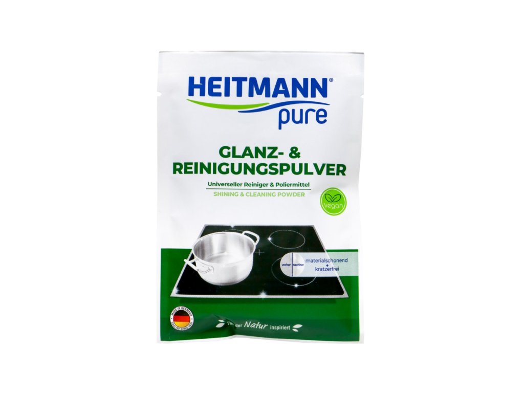 Heitmann Pure Shine je více než jen čistící prostředek. Je to leštidlo, přírodní abrazivum i šetrný čistič v jednom. Poradí si s připáleninami na hrncích, s usazeninami v koupelně i s matným povrchem nerezové konvice. Stačí jen malé množství prášku a vlhký hadřík či houbička – žádná složitá příprava, žádné kompromisy.