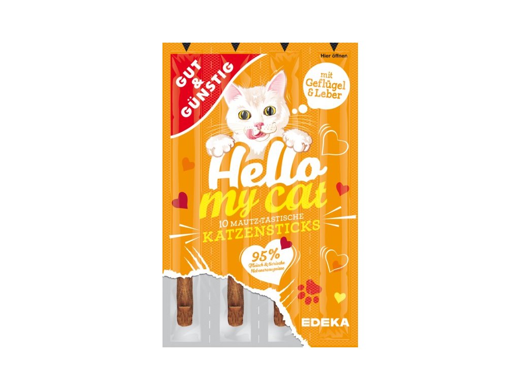 Parametry: Žvýkací tyčinky s drůbežím a játry. S 95% obsahem masa! Složení: maso a živočišné vedlejší výrobky (95%, mimo jiné 6% drůbež, 6% játra), rostlinné bílkovinové extrakty, rostlinné vedlejší výrobky, minerální látky, droždí. Analytické složky: Syrový Bílkoviny: 33,5%, syrový tuk: 20%, syrová vláknina: 2%, popel: 10%, vlhkost: 31% Doporučené dávkování: Jako doplňkové krmivo mezi hlavními jídly může průměrná kočka (4 kg) dostat 1-2 tyčinky denně. Zajistěte Vašemu psovi dostatek čerstvé vody (o pokojové teplotě). Dbejte na to, aby kočka měla dostatek pohybu. Edeka Zentrale AG & Co. Kg, Hamburg, Německo.