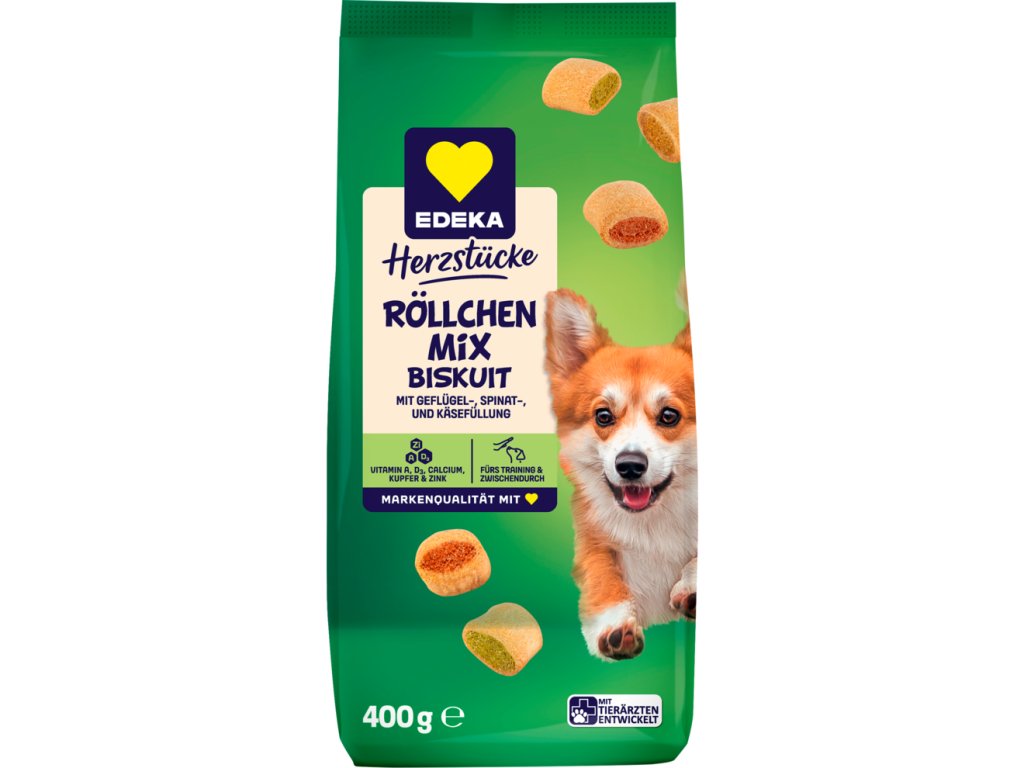 Edeka Biskuit-Rolls masové rolky Mix s drůbežím, špenátem a sýrem je vysoce chutný doplňkový krmný produkt určený pro dospělé psy. Tento mix nabízí lahodné a pestrobarevné pamlsky, které vašeho psa určitě potěší.
