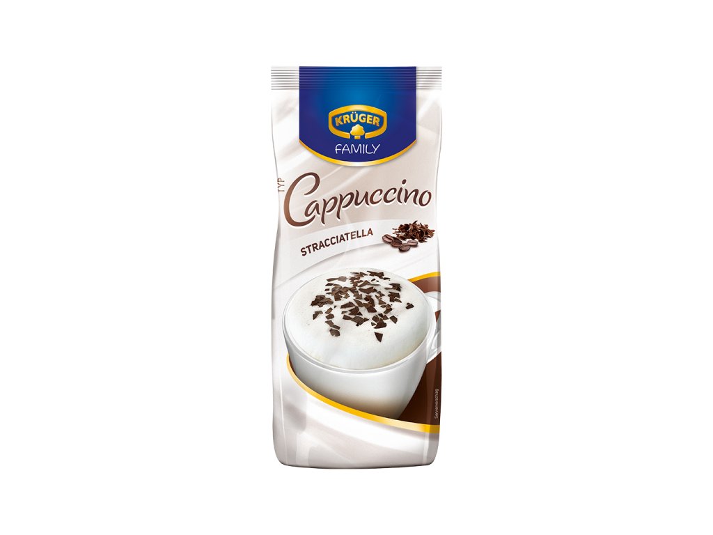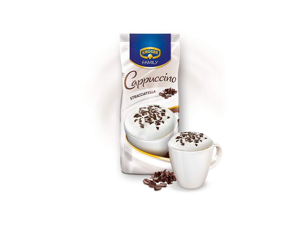 **Krüger Family Cappuccino Stracciatella** spojuje jemnou kávu, mléčnou pěnu a pravé čokoládové kousky. **Obsahuje 6 % hořké čokolády**, **3,5 % kávy**, a nabízí **sladkou chuť Itálie** v každém šálku. **Rychlá příprava**, **bohatá chuť**, **německá kvalita**.