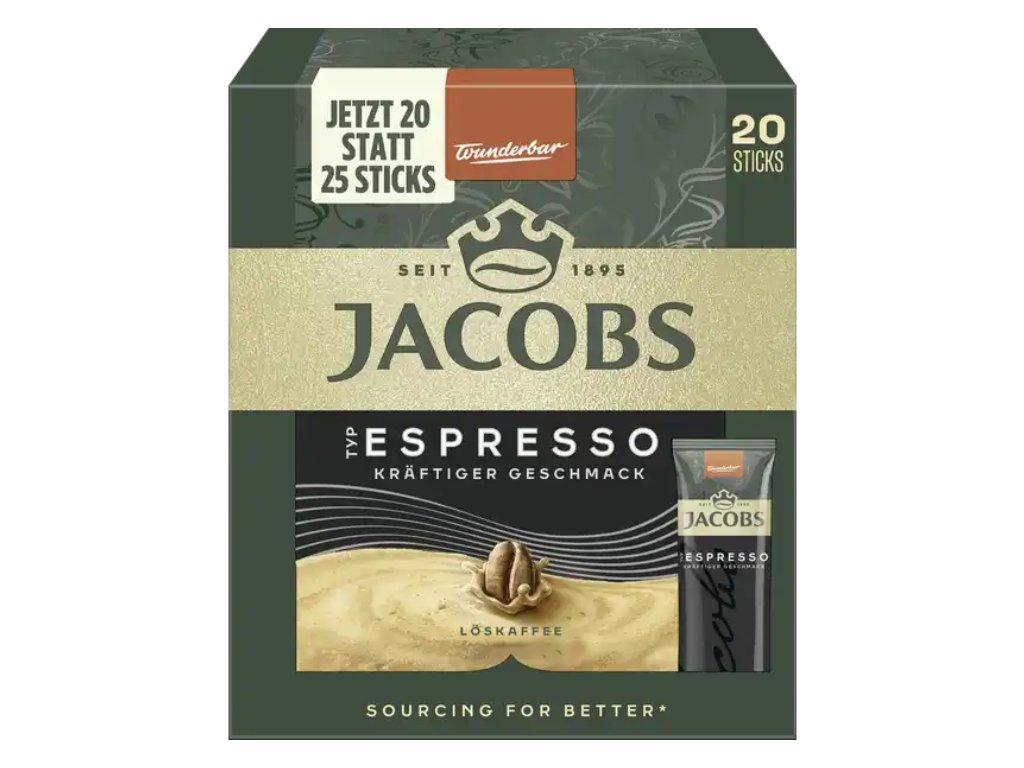 Silná a aromatická instantní káva ve 20 porcích. Jacobs Espresso Sticks nabízí rychlou a intenzivní kávu kdykoli a kdekoli. 100% kávový extrakt, praktické balení, německá kvalita