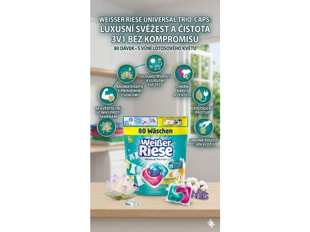 Weisser Riese Universal Trio Caps Aromaterapie s vůní lotosového květu jsou praktické a vysoce účinné prací kapsle, které byly vyvinuty pro šetrné, ale zároveň efektivní praní různých druhů prádla. Toto balení obsahuje 80 kapslí s celkovou hmotností 960 gramů, což je dostatek pro 80 dávek prádla. Následující popis vám přinese podrobný přehled o tomto výrobku.