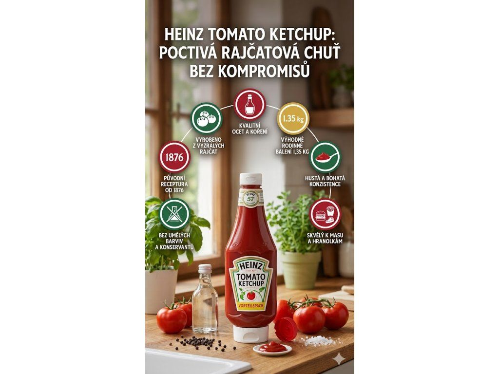 Když se řekne kečup, většina z nás si automaticky vybaví právě Heinz. Tento legendární rajčatový kečup byl poprvé vytvořen v roce 1876 a od té doby si udržuje svou nezaměnitelnou recepturu. Vyroben z vyzrálých rajčat, kvalitního octa a pečlivě vybraného koření – bez použití barviv, zahušťovadel či konzervantů. Díky balení 1,35 kg ve výhodném rodinném formátu si ho teď můžete dopřát opravdu naplno – ať už při grilování, vaření nebo každodenním stolování.