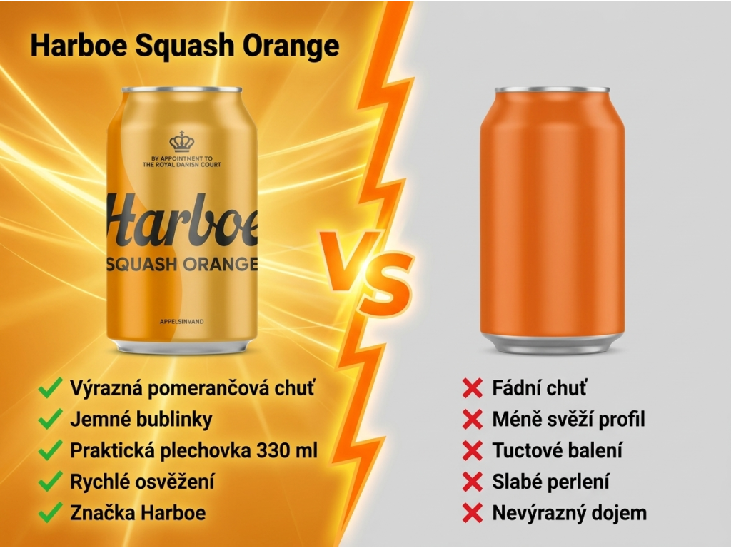Běžné oranžové limonády často spoléhají hlavně na sladký dojem, ale chybí jim svěžest a zapamatovatelný profil. Harboe Squash Orange proti tomu působí živěji, má čistší citrusový charakter a díky formátu 330 ml je navíc praktičtější pro chvíle, kdy chceš otevřít právě jednu dobře vychlazenou plechovku.