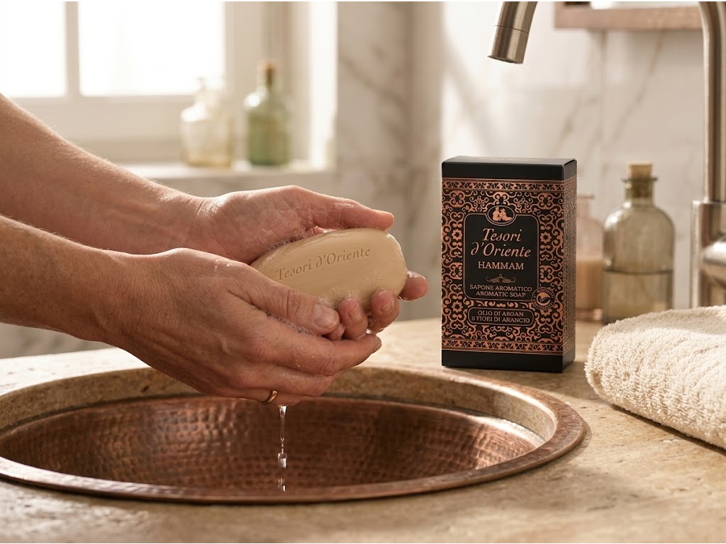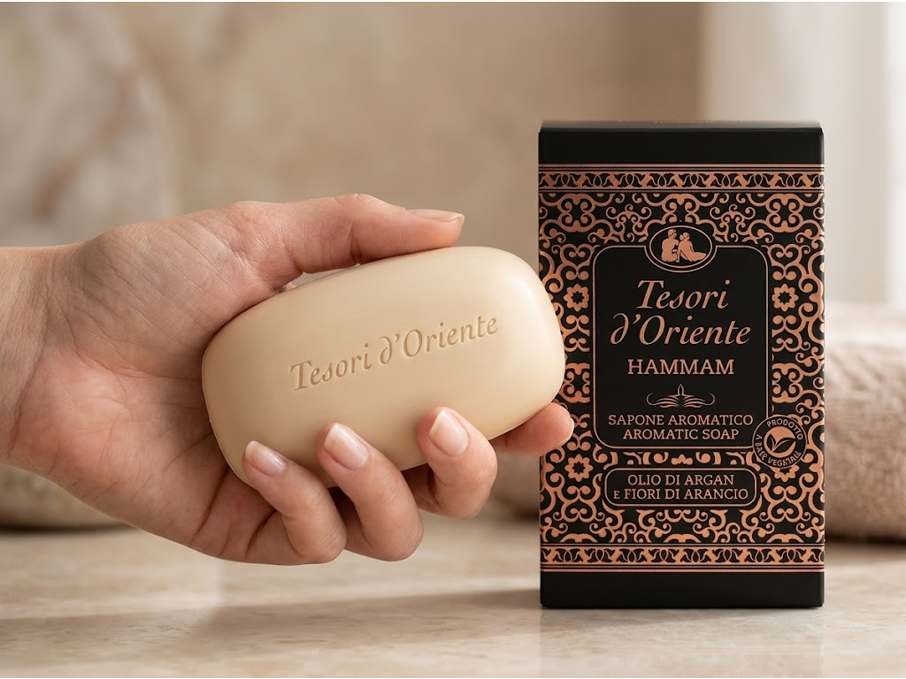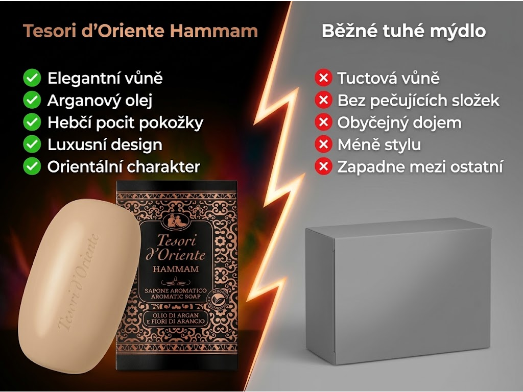 Běžné tuhé mýdlo bývá hlavně praktické, ale málokdy si ho zapamatuješ. Tesori d'Oriente Hammam naproti tomu nabízí i výraznější atmosféru, promyšlený design a vůni, která působí luxusněji a osobitěji. Díky tomu není používání jen rutinní krok, ale příjemnější součást dne.
