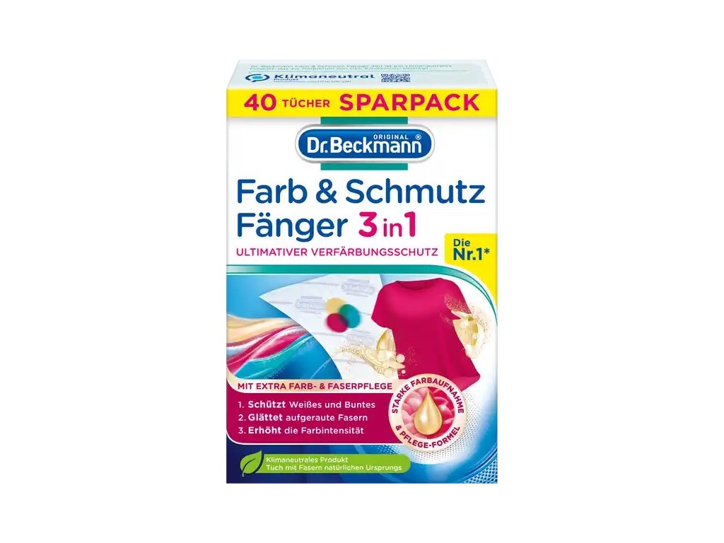 Ubrousky Dr. Beckmann na zachytávání barev a nečistot rychle absorbují unikající barvy z vody a okamžitě je vážou. Všechny oděvy tak zůstávají spolehlivě chráněny před změnou barvy, zejména textilie s bílým obsahem.