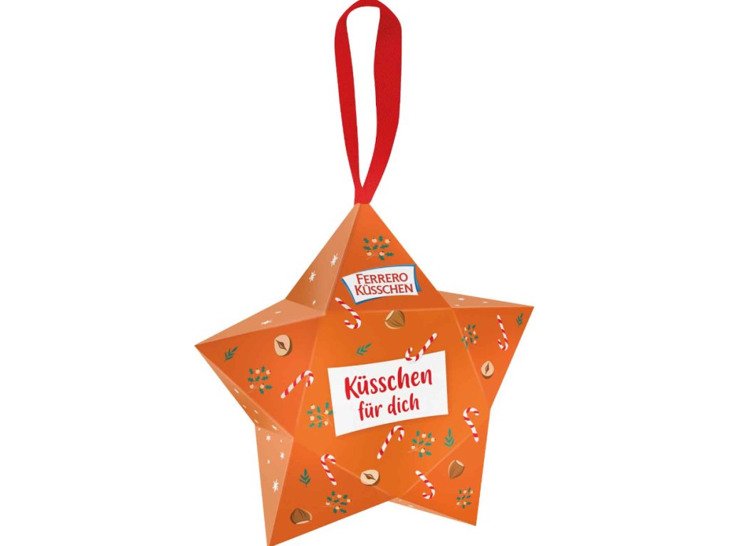 Hledáte malý dárek, který potěší nejen chutí, ale i vzhledem? Ferrero Küsschen malá vánoční hvězda je elegantní a zároveň hravá sladkost v dekorativním balení, které rozjasní každý vánoční stromeček. Uvnitř oranžové hvězdy se skrývají čtyři prémiové pralinky Ferrero Küsschen – každá s celým lískovým oříškem a kombinací jemné mléčné i hořké čokolády. Díky červené stužce na zavěšení je hvězda nejen dárkem, ale i krásnou ozdobou.