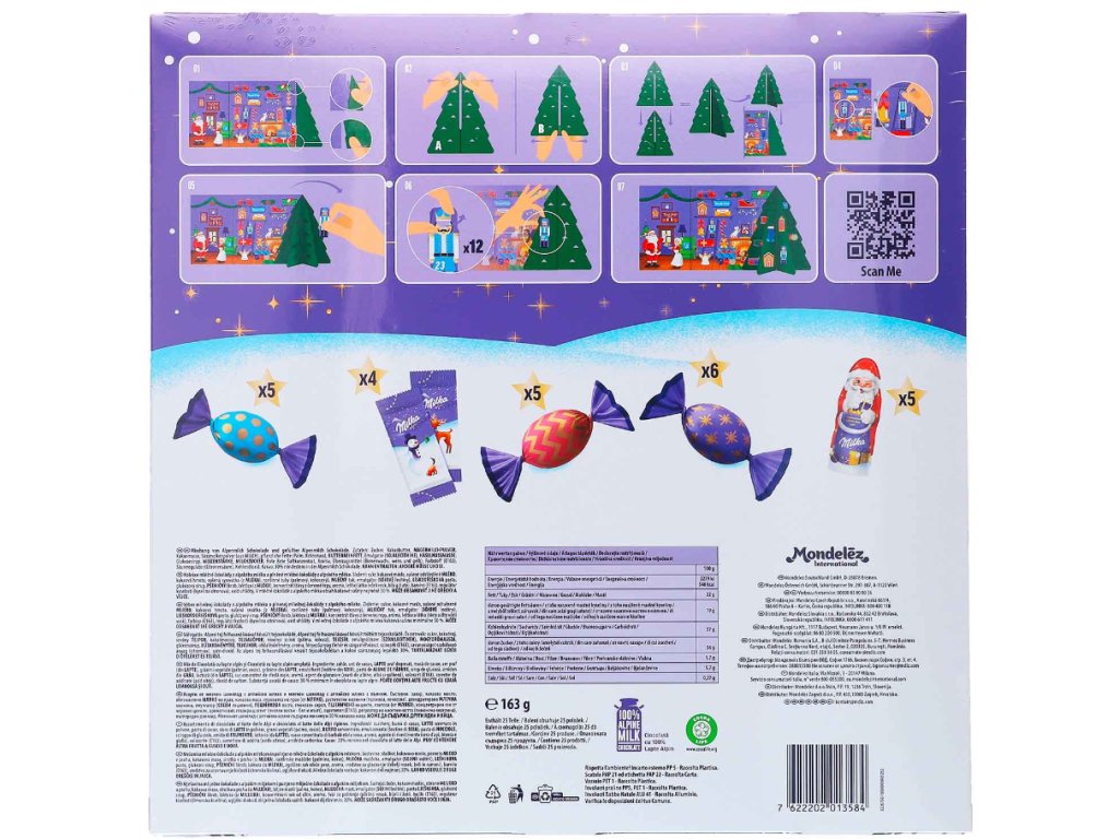 Kalendář obsahuje 25 různých čokoládových kousků – každý den něco nového. Čekají na vás například: Čokoládové kuličky s krémovou náplní Mini tabulky z alpské mléčné čokolády Roztomilé čokoládové figurky s vánoční tematikou Speciální Milka čokolády určené jen pro tento kalendář Všechny dobroty jsou vyrobeny z jemné čokolády s obsahem kvalitního mléka a kakaa, jak je u značky Milka zvykem. Tato kombinace lahodné chuti a tvořivé zábavy dělá z kalendáře zážitek, na který se budete těšit každý den.
