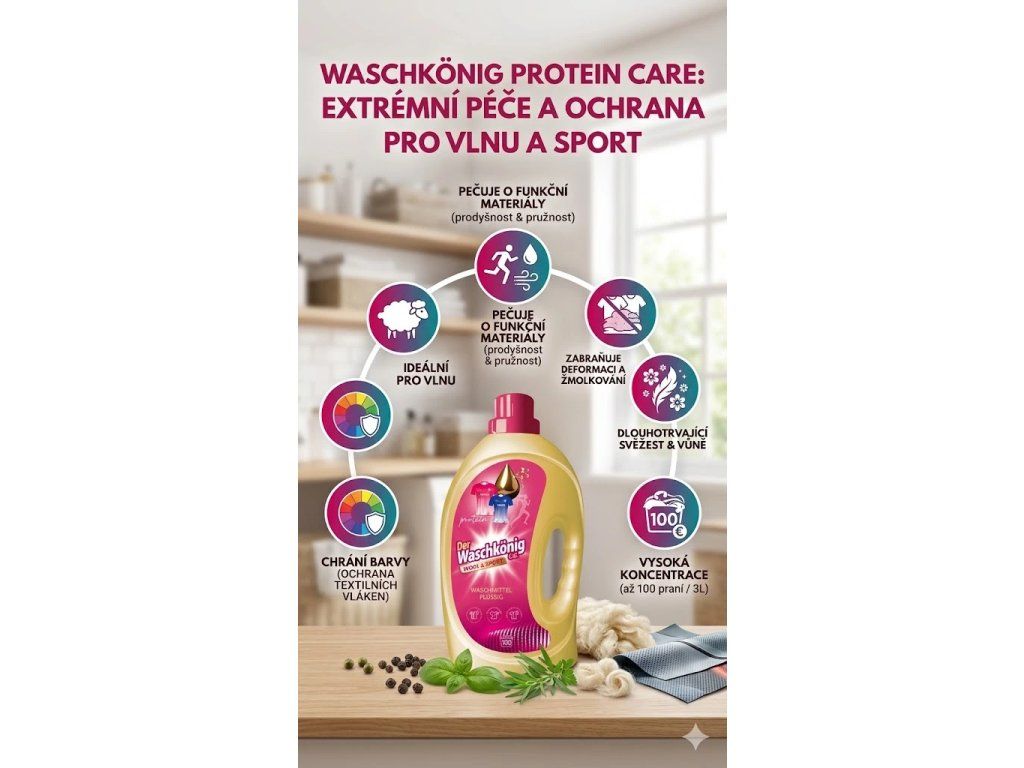 WaschKönig Protein Care Wool & Sport je vysoce účinný prací gel navržený speciálně pro jemné sportovní oblečení a vlnu. Tento německý prací prostředek o objemu 3 litry je koncentrovaný a vystačí až na 100 dávek, což zajišťuje jeho dlouhou výdrž a ekonomickou efektivitu. Díky své jedinečné receptuře poskytuje praní, které nejen dokonale čistí, ale zároveň pečuje o citlivá vlákna sportovních materiálů a jemné tkaniny jako vlna, čímž prodlužuje jejich životnost. Prací gel je navržen s ohledem na náročné používání sportovního oblečení, které často čelí extrémní zátěži.