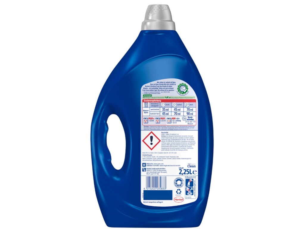 Parametry: Složení: 5–15 % aniontové povrchově aktivní látky, <5 % neiontové povrchově aktivní látky, fosfonáty, mýdlo. Další složky: enzymy, parfém (GERANIOL, CITRONELLOL), optické zjasňovače, konzervační látky (BENZISOTHIAZOLINONE, METHYLISOTHIAZOLINONE). Upozornění: Způsobuje vážné podráždění očí. Může způsobit alergické reakce. Obsahuje 1,2-benzisothiazol-3(2H)-on. Uchovávejte mimo dosah dětí. Používejte ochranu očí. Při zasažení očí: několik minut vyplachujte vodou, vyjměte kontaktní čočky, pokud jsou nasazeny. Pokud podráždění přetrvává, vyhledejte lékaře. Životní prostředí: Obal a obsah likvidujte dle místních předpisů. Recyklujte prázdné a čisté nádoby.
