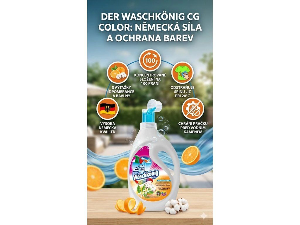 Vysoce kvalitní německý gel na praní barevných tkanin Der Waschkönig CG Color s výtažky z pomeranče a bavlny. Koncentrované složení vystačí na 3litrové balení až na 100 praní. Výrobek se vyznačuje novou, intenzivní vůní pomeranče.