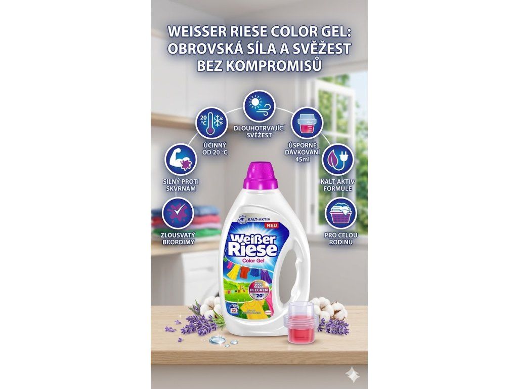 - Vysoká účinnost: Weisser Riese Color prací gel se vyznačuje mimořádnou účinností při odstraňování skvrn, zajišťuje hygienickou čistotu a zářivou čistotu prádla.