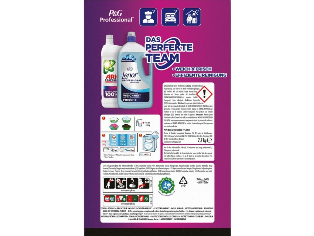 | Parametry: | Složení: 15–30 % aniontové povrchově aktivní látky, <5 % neiontové povrchově aktivní látky, fosfonáty, polykarboxyláty, zeolity, enzymy, parfémy, hexyl cinnamal, tetraacetylethylendiamin, optické zjasňovače Upozornění a bezpečnostní pokyny: Způsobuje vážné podráždění očí. Uchovávejte mimo dosah dětí. PŘI ZASAŽENÍ OČÍ: Několik minut opatrně vyplachujte vodou. Vyjměte kontaktní čočky, jsou-li nasazeny a pokud je lze snadno vyjmout. Pokračujte ve vyplachování. Při přetrvávajícím podráždění očí: Vyhledejte lékařskou pomoc/ošetření. Při lékařském ošetření mějte k dispozici obal nebo etiketu výrobku. Může vyvolat alergickou reakci. Obsahuje hexyl cinnamal. Používejte pouze pro profesionální použití. |