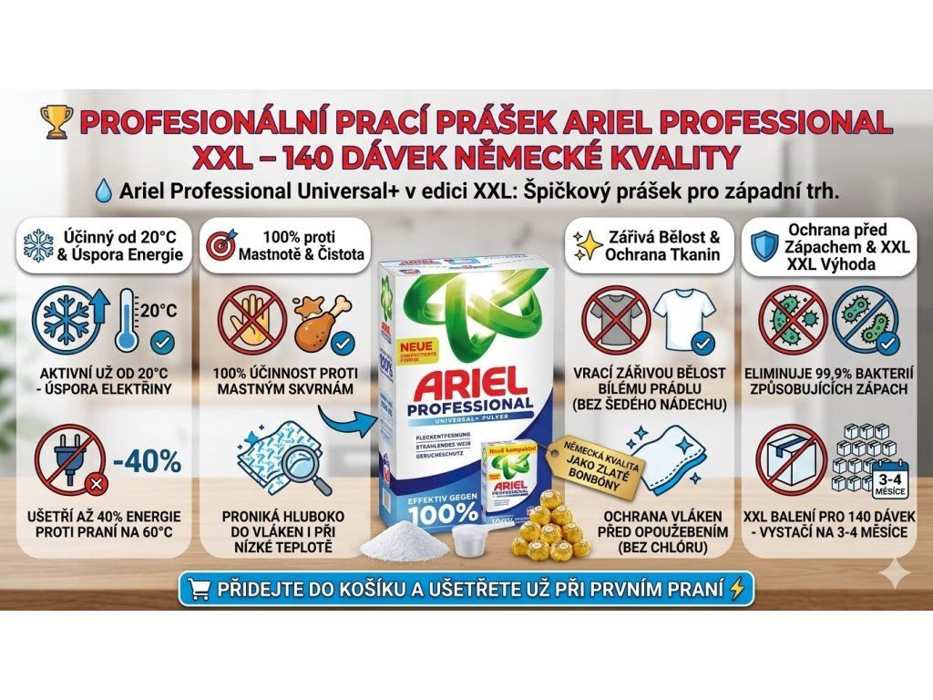 Více než 5000 českých rodin si tento měsíc vybralo Ariel Professional XXL jako své řešení pro čisté prádlo bez kompromisů. Proč platit víc za méně účinné produkty? Objednejte dnes a získáte profesionální kvalitu, která vám vystačí na měsíce dopředu. Oblíbený produkt se rychle vyprodává – zajistěte si zásobu pro celou rodinu teď a přestaňte řešit skvrny, šedé prádlo a vysoké účty za energie. Vaše prádlo si zaslouží to nejlepší. 💙