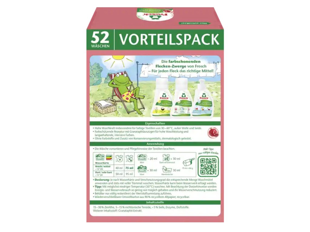 Šetrná péče o barvy: Frosch Colorwaschmittel je navržen tak, aby chránil barvy vašich textilií. Vysoká prácí síla zajišťuje, že i při pravidelném praní zůstanou vaše oblíbené barvy jasné a zářivé.