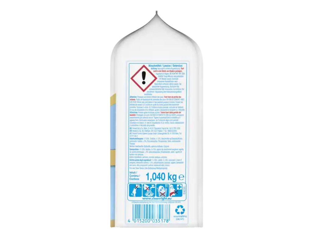 Parametry: Složení: 15–30 %: zeolity, 5–15 %: bělidla na bázi kyslíku, aniontové povrchově aktivní látky, <5 %: polykarboxyláty, fosfonáty, mýdlo, neiontové povrchově aktivní látky. Další složky: parfém, optické zjasňovače, enzymy. Upozornění a bezpečnostní pokyny: POZOR Způsobuje vážné podráždění očí. Uchovávejte mimo dosah dětí. Používejte ochranu očí. PŘI ZASAŽENÍ OČÍ: Několik minut opatrně vyplachujte vodou. Pokud jsou nasazeny kontaktní čočky a lze je snadno vyjmout, vyjměte je. Pokračujte ve vyplachování. Při přetrvávajícím podráždění očí vyhledejte lékařskou pomoc/ošetření. Pokud je nutná lékařská pomoc, mějte po ruce obal nebo etiketu výrobku. Podmínky použití a skladování: Přepravujte a skladujte ve vzpřímené poloze. Dávkování: Vždy se řiďte pokyny k dávkování uvedenými na obalu. Správné dávkování závisí na velikosti pračky, tvrdosti vody a stupni znečištění prádla.