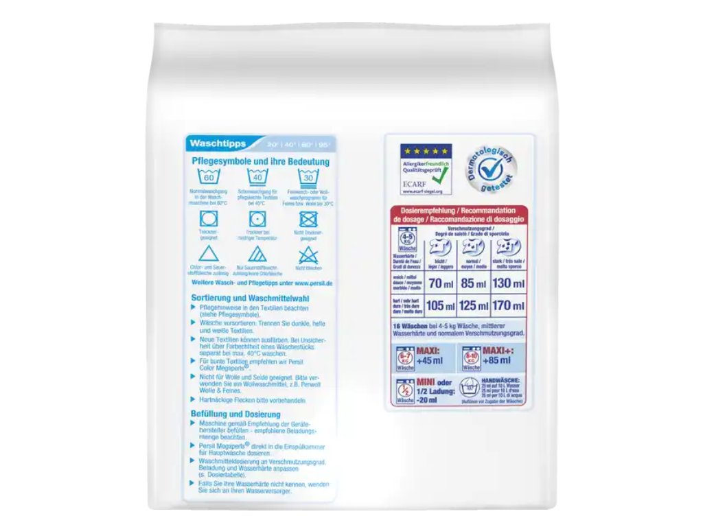 • Hypoalergenní a dermatologicky testováno: Persil Sensitive Megaperls je dermatologicky testováno a hypoalergenní, což zaručuje, že je bezpečné pro citlivou pokožku. Bylo testováno a potvrzeno ve spolupráci s dermatology a je certifikováno ECARF, což potvrzuje, že je vhodné pro alergiky.
