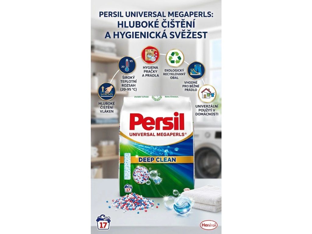 Bílé prádlo oslnivě bílé, skvrny pryč a svěží vůně, která vydrží — Persil Universal Megaperls Deep Clean je prémiový německý prací prášek ve formě mega perel, navržený pro bílé a stálobarevné prádlo. Na rozdíl od verze Color obsahuje bělicí přísady na bázi kyslíku, které vracejí bílému prádlu zářivou bělost praní za praním. 17 dávek v balení 1,02 kg, účinný už od 20 °C. Dovezeno z Německa.