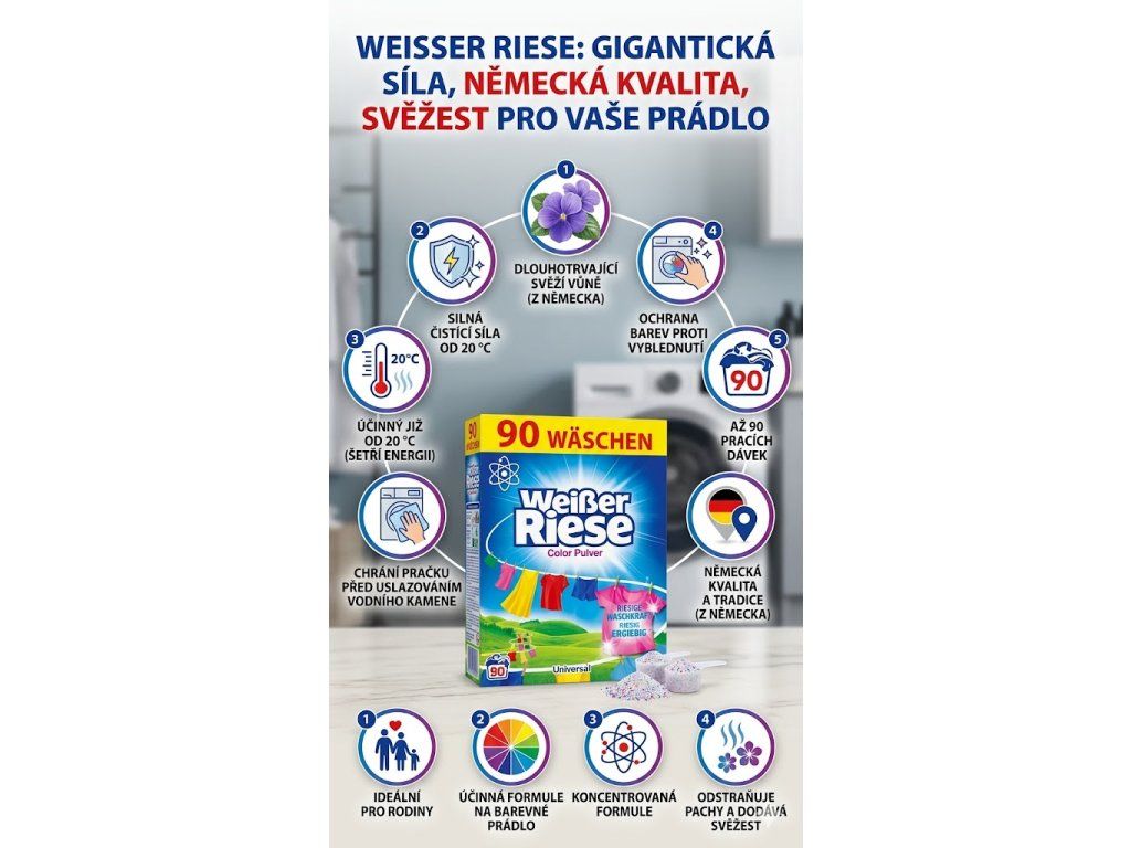 Weißer Riese je tradiční značka pracích prostředků, kterou ocení hlavně rodiny – tam, kde se perou opravdu velké várky. Kvalita, kterou prověřily generace, nyní dostupná i pro vás.