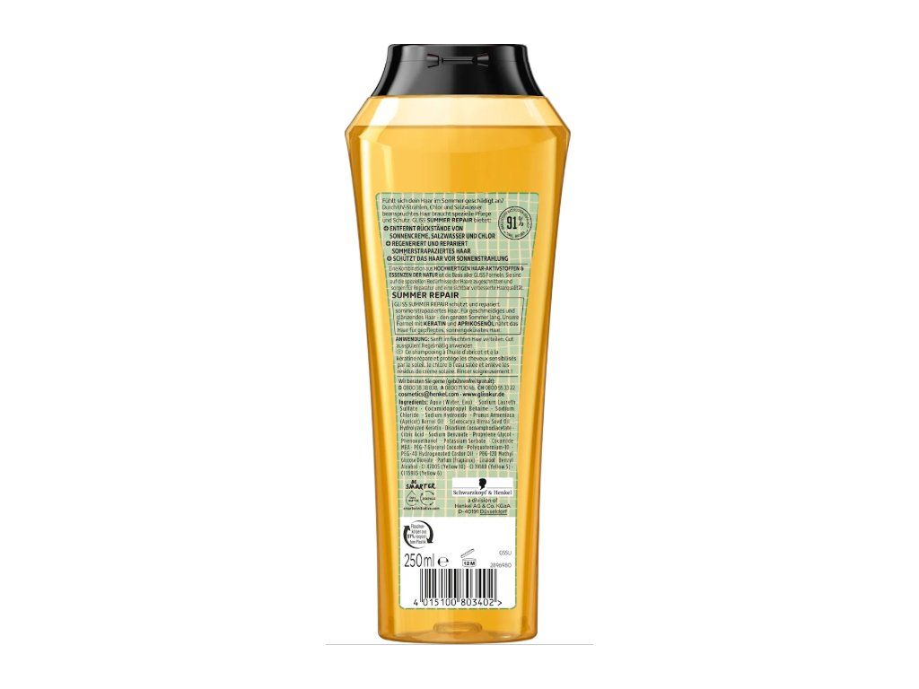 Dopřej svým vlasům intenzivní letní péči se šamponem Gliss Kur Summer Repair od Schwarzkopf. Speciálně vyvinutý pro vlasy namáhané sluncem, chlórem a slanou vodou, tento regenerační šampon účinně odstraňuje zbytky opalovacích krémů, chlóru a soli, zatímco obnovuje vlasovou strukturu pomocí keratinu, omega 9 mastných kyselin a meruňkového oleje.