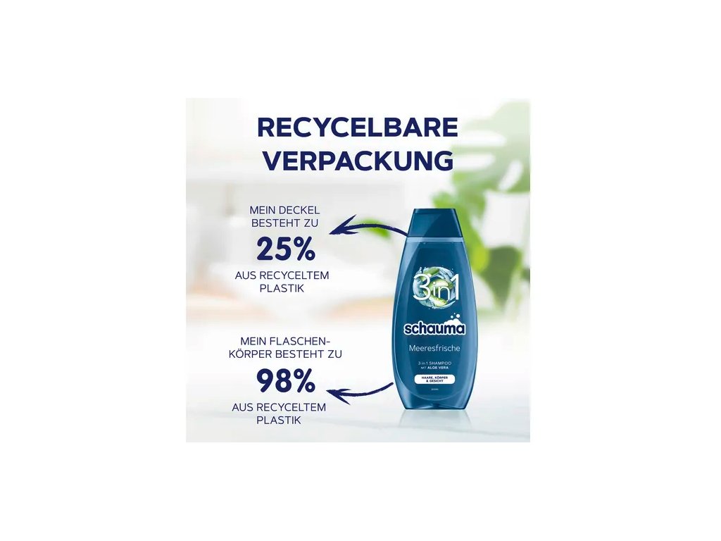 Se šamponem Schauma 3v1 Sea Freshness získáte praktické a efektivní řešení pro každodenní péči o vaše vlasy, tělo a obličej. Ideální pro celou rodinu a pro každého, kdo oceňuje produkty šetrné k životnímu prostředí. Pečujte o to, co je pro vás důležité. Buď chytrý. Recyklovat.