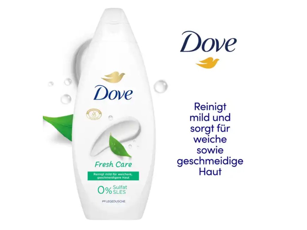 Na rozdíl od mnoha běžně dostupných sprchových gelů s obsahem SLES a silných parfemací Dove Fresh Care čistí jemně a pečuje již během mytí. Nepůsobí agresivně, nevyvolává suchost a dlouhodobě podporuje zdravý vzhled pokožky. Jeho složení je dermatologicky testováno a odpovídá náročným německým standardům kvality.