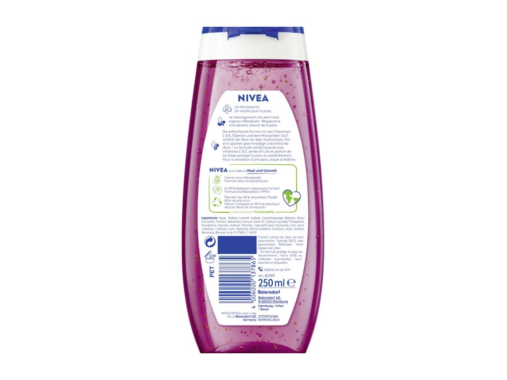 Na rozdíl od běžných sprchových gelů, které často vysušují pokožku nebo obsahují syntetické polymery, Nivea Waterlily & Oil přináší kombinaci péče a čistoty. Bez mikroplastů, bez syntetických vodorozpustných polymerů, s 99% biologickou odbouratelností. Lahev je vyrobena z 96 % recyklovaného plastu (bez víčka a etikety). Jednoduchý, ale funkční design i složení, které ctí potřeby vaší pokožky i planety.