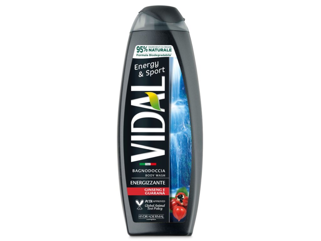 Vidal Energy & Sport je povzbuzující sprchový gel s výtažky z ženšenu a guarany, které dodají energii a povzbudí vás po sportovním výkonu, náročném dni nebo ráno při vstávání. Díky Hydradermal komplexu zůstane vaše pokožka hydratovaná, jemná a svěží.