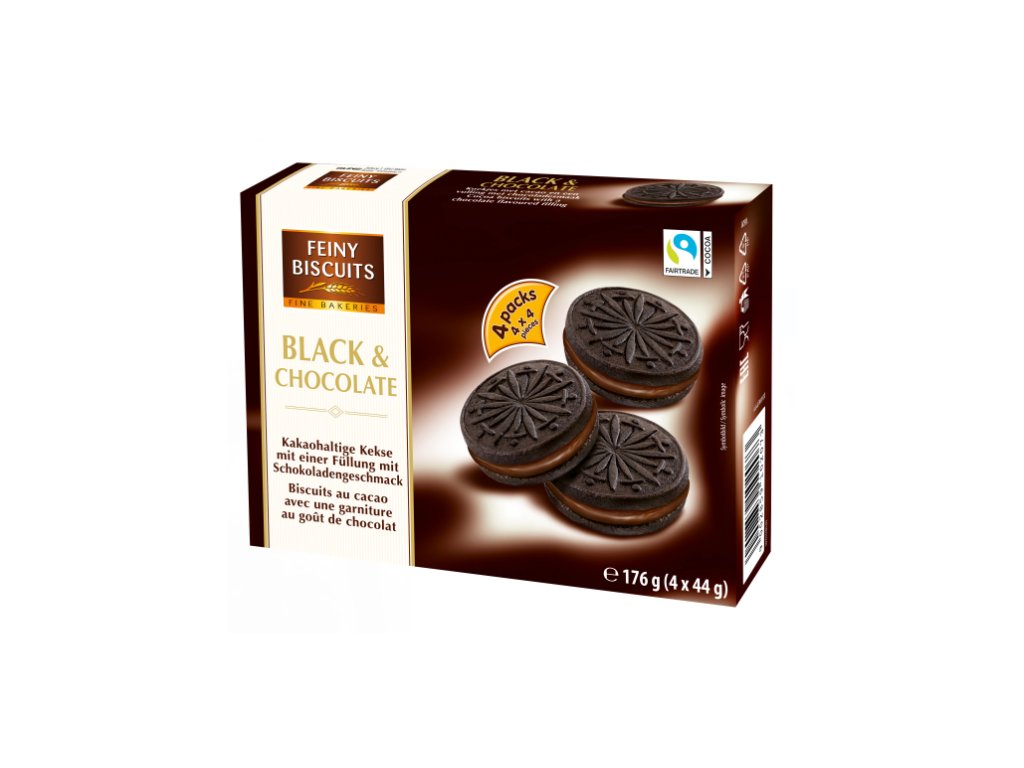 Feiny Biscuits Black & Chocolate sušenky 176 g jsou lahodné kakaové sušenky spojené jemnou čokoládovou krémovou náplní (25 %), které tvoří dokonalé sušenkové sendviče. Tyto sušenky chutnají výborně samostatně, ale také s čerstvým mlékem, šálkem čaje nebo kávy. Balení obsahuje 4 praktické porce po 4 kusech, díky čemuž se skvěle hodí do školy, práce nebo na cesty.