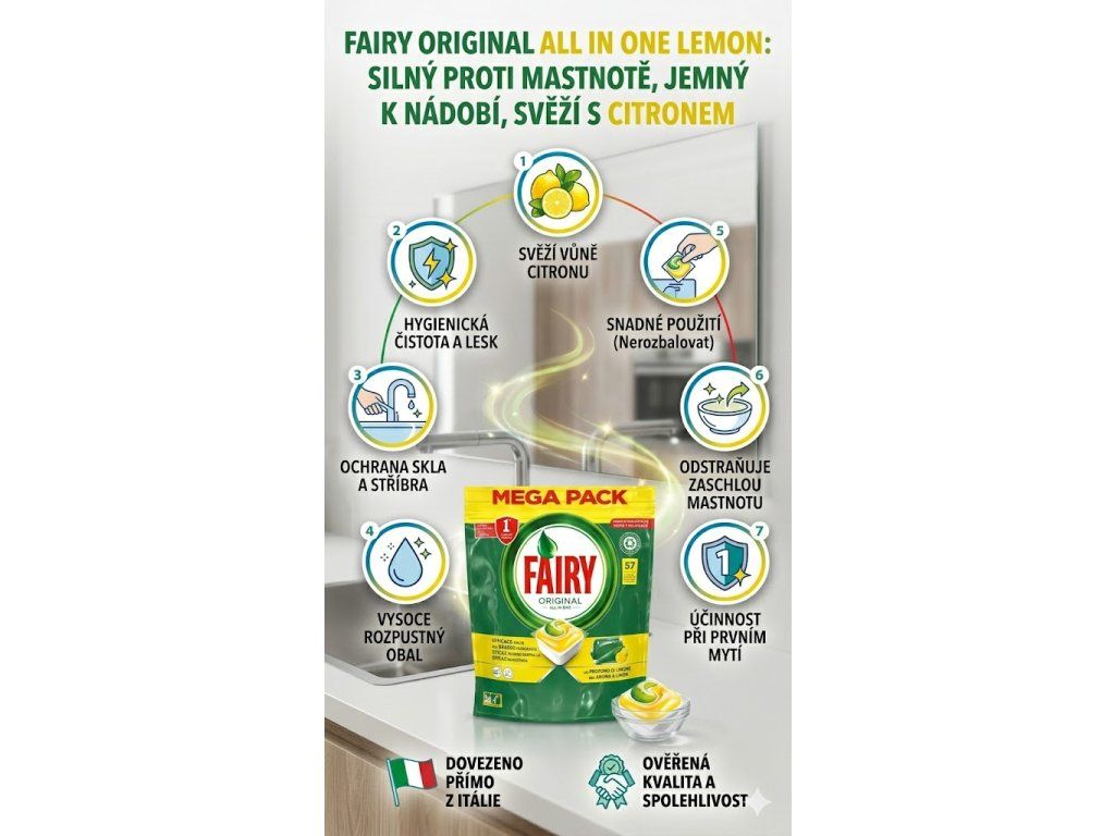 Objevte sílu dokonalé čistoty a svěžesti s Fairy Original All In One Lemon. Tyto multifunkční kapsle zajišťují, že i silně znečištěné nádobí a zaschlé skvrny budou beze zbytku odstraněny již při prvním mytí. Každá kapsle Fairy Original kombinuje tekutý i práškový prací prostředek, čímž vytváří silný čisticí účinek v jediné dávce.