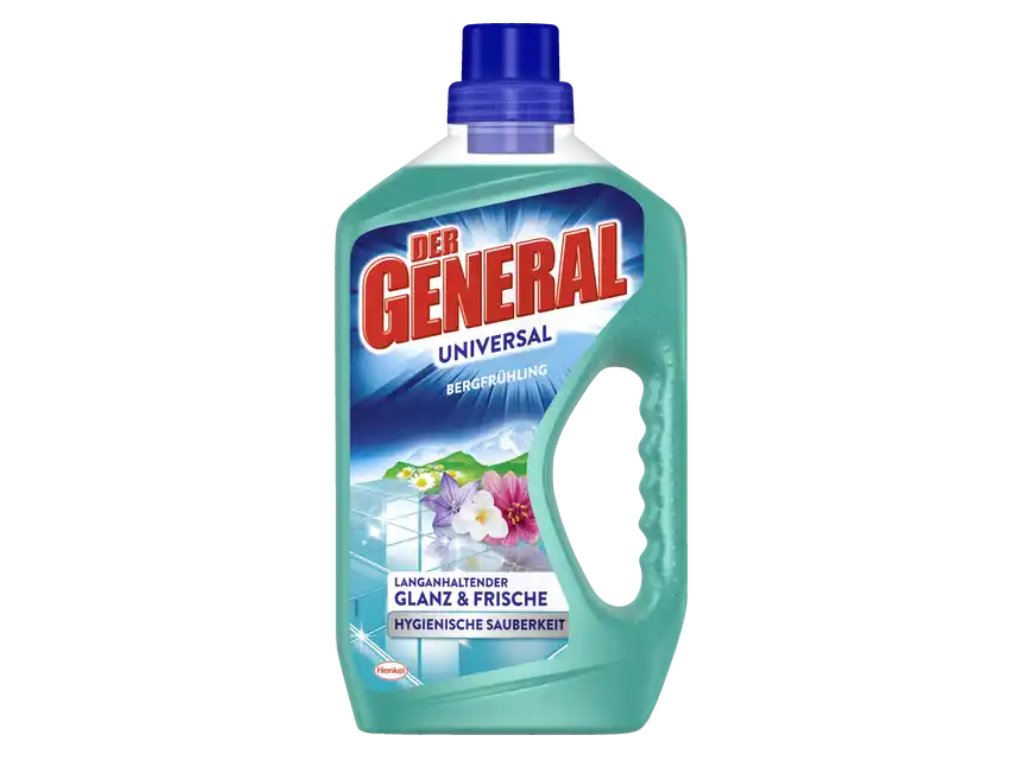 Univerzální čistič Der GENERAL Bergfrühling od značky Henkel přináší hygienickou čistotu, dlouhotrvající lesk a svěží vůni horského jara. Tento víceúčelový čistič je určen pro všechny omyvatelné povrchy v domácnosti – podlahy, kachličky, kuchyňské linky i koupelny.