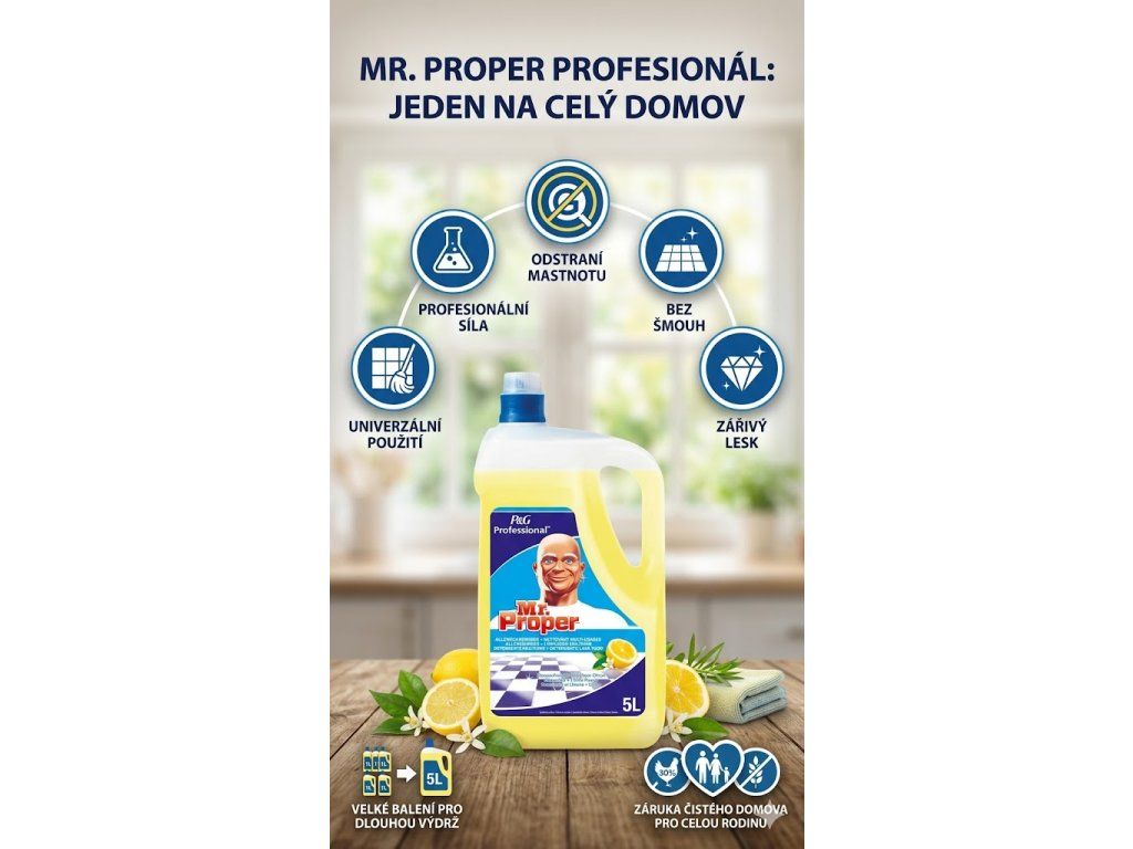 Představte si, že máte jeden jediný prostředek, který si poradí s celou domácností – od podlah až po kuchyňské povrchy. Mr. Proper profesionální univerzální čistič citrus vám přesně tohle umožní. Díky své silné, ale přitom šetrné receptuře odstraní nečistoty, mastnotu i zaschlé skvrny a zanechá po sobě zářivý lesk bez šmouh a svěží citrusovou vůni. Úklid se tak stává rychlejší, jednodušší a mnohem příjemnější.