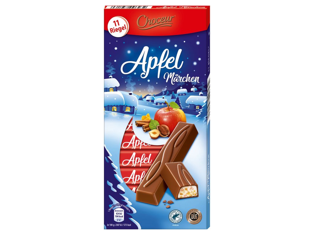 Choceur Apfel-Märchen je prémiová mléčná čokoláda s obsahem kakaa minimálně 32 %, což zajišťuje bohatou, sametově jemnou chuť. Uvnitř každé tyčinky najdete plnou 40,8% náplň z jemného skořicového krému, který se dokonale doplňuje s ovocnými tóny sušeného jablka, výraznými kousky lískových oříšků a křupavou texturou cornflakes. 11 samostatně balených tyčinek v elegantním zimním balení potěší jak doma, tak jako stylový dárek.