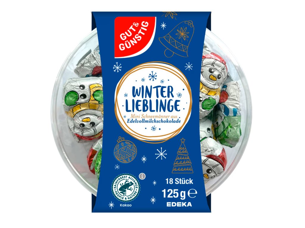 Mini sněhuláci GUT&GÜNSTIG jsou ideálním zimním pokušením – krásní na pohled, lahodní na chuť. Ať už jako odměna pro děti, detail do balíčku nebo jen tak pro radost, vždy potěší svou kvalitou i vzhledem. Poctivá čokoláda, která má úsměv.