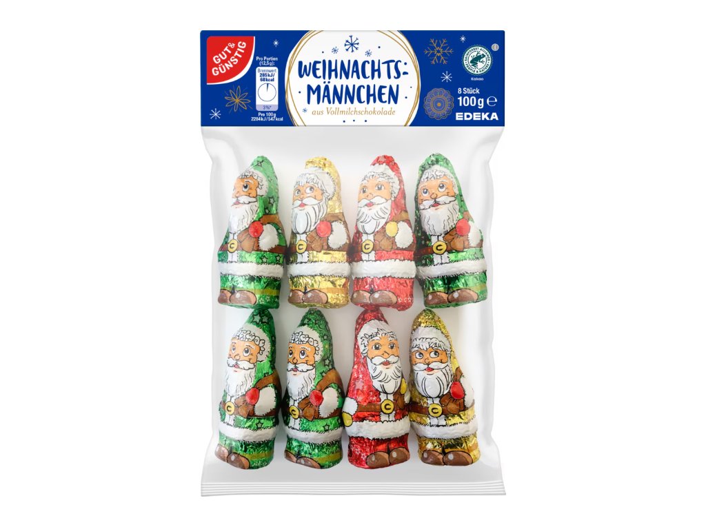 Parametry: | Složení: cukr, kakaové máslo**, SUŠENÉ PLNÉ MLÉKO, kakaová hmota**, SUŠENÁ SLADKÁ SYROVÁTKA, emulgátor (lecitiny – obsahuje SÓJU), vanilkový extrakt. Může obsahovat stopy: OŘECHŮ (včetně MANDLÍ a PISTÁCIÍ), ARAŠÍDŮ, LEPKU a SÓJI. Výrobek: Duté figurky z mléčné čokolády. Hmotnost: 100 g (8 ks) Energetická hodnota na 100 g: 2284 kJ / 547 kcal Tuky: 32 g – z toho nasycené mastné kyseliny: 19 g Sacharidy: 57,1 g – z toho cukry: 56,5 g Bílkoviny: 6,6 g Sůl: 0,2 g Skladování: Uchovávejte v suchu, chraňte před teplem. Kakao: minimálně 30 %, certifikováno Rainforest Alliance. Značka: GUT&GÜNSTIG / EDEKA |