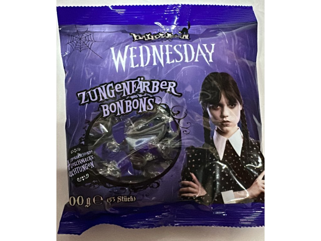 Chcete si užít Halloween s pořádnou dávkou zábavy? Tyto Wednesday Zungenfärber Bonbons promění obyčejné cucání bonbónu v temně legrační zážitek! Každý bonbon nejenže chutná ovocně a svěže, ale také obarví jazyk do tajemných odstínů – ideální pro děti, party i tematické oslavy. Inspirováno kultovní postavou Wednesday Addams, v limitované halloweenské edici!