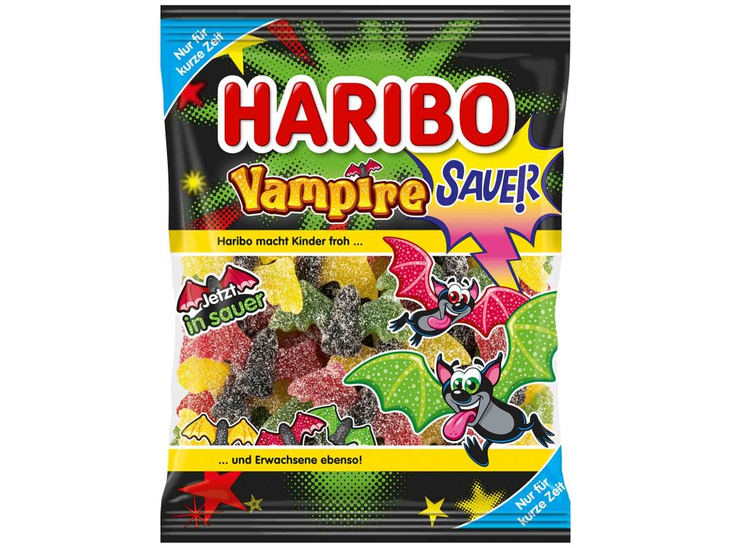 Lahodné sousto! S Haribo upíry sour můžete zažít oblíbené netopýry v obzvláště pikantní verzi. Sladké ovocné žvýkačky jsou ve 3 ovocných příchutích - jablko, citron a třešeň - a s tělem z pikantní jemné lékořice. Superkyselá poleva vnáší do hry ještě více svěžesti.