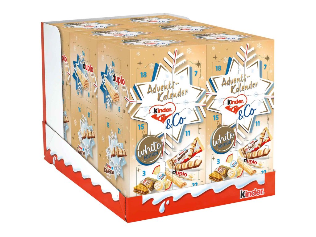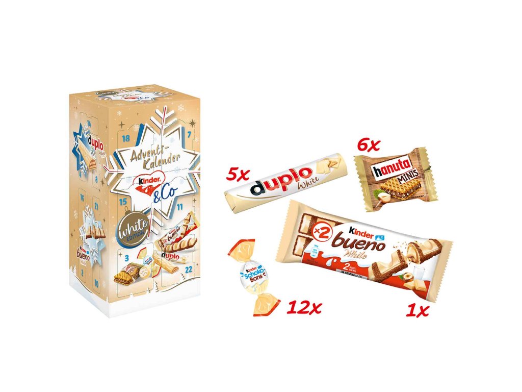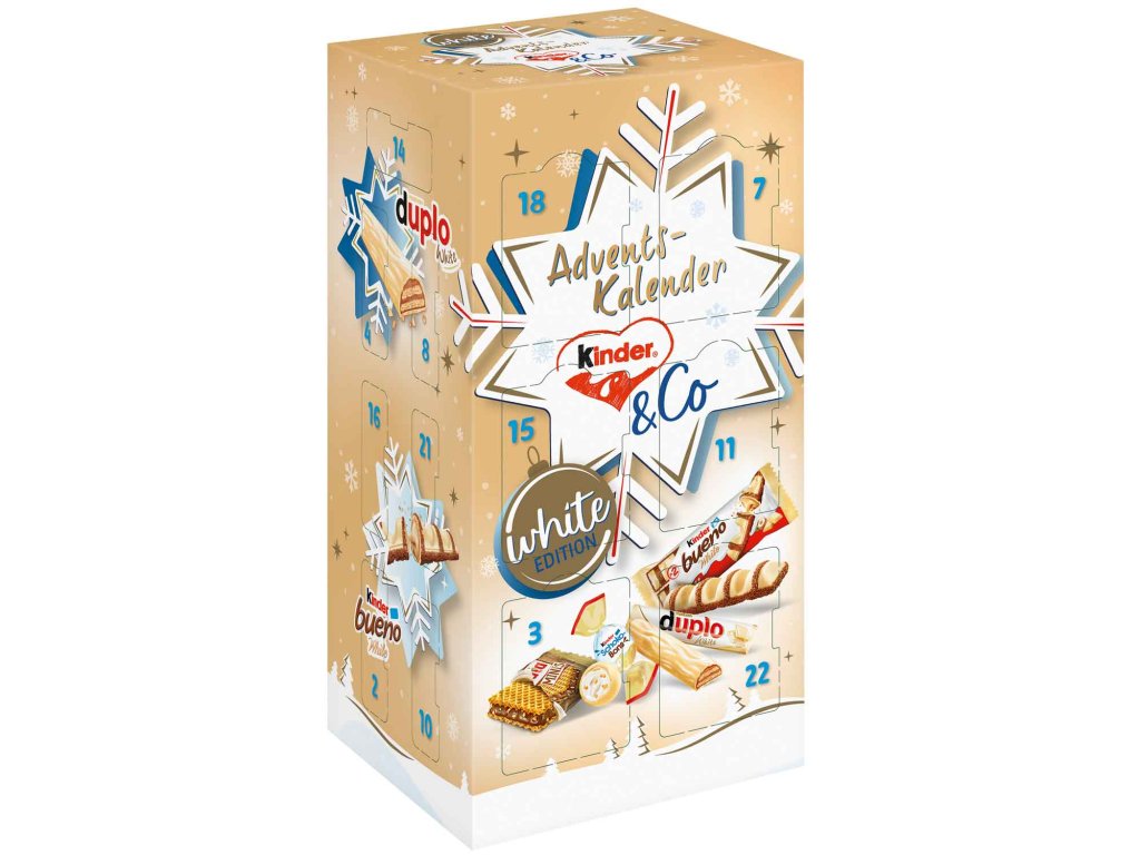 Bílé Vánoce plné radosti! Se skvělým kinder & Co. White Advent calendar si milovníci bílé čokolády přijdou na své. Kalendář je až po okraj naplněn bílými dobrotami od společnosti Ferrero a každý den přináší nové překvapení. Těšte se na rozmanité chvíle potěšení a krásné vánoční období.Bílé Vánoce plné radosti! Se skvělým kinder & Co. White Advent calendar si milovníci bílé čokolády přijdou na své. Kalendář je až po okraj naplněn \